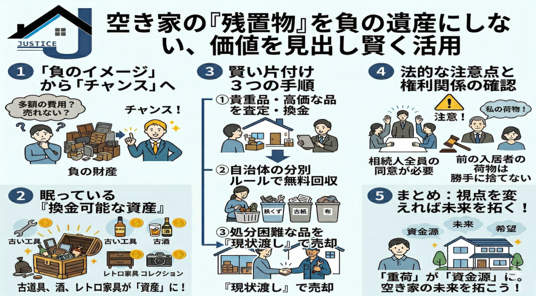 空き家の残置物は、決して「負の財産」だけではありません。それは、かつてそこで営まれていた生活の証であり、新しい活用を助ける「資金源」にもなり得ます。