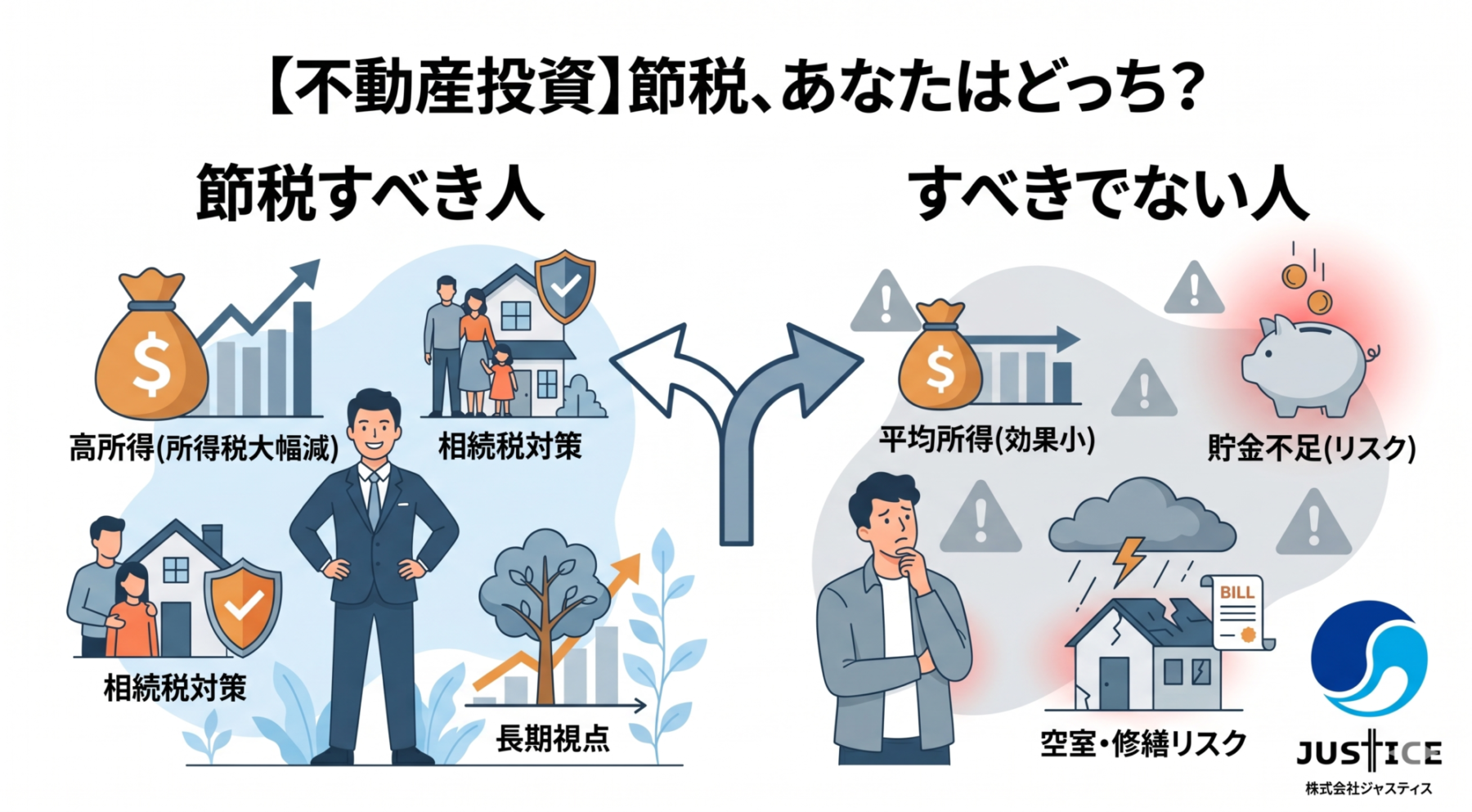 この記事では、不動産投資で「節税すべき人」と「すべきでない人」の決定的な違いを、日常的な言葉でわかりやすく解説します。ご自身の状況と照らし合わせて、後悔しない選択をするための参考にしてください。