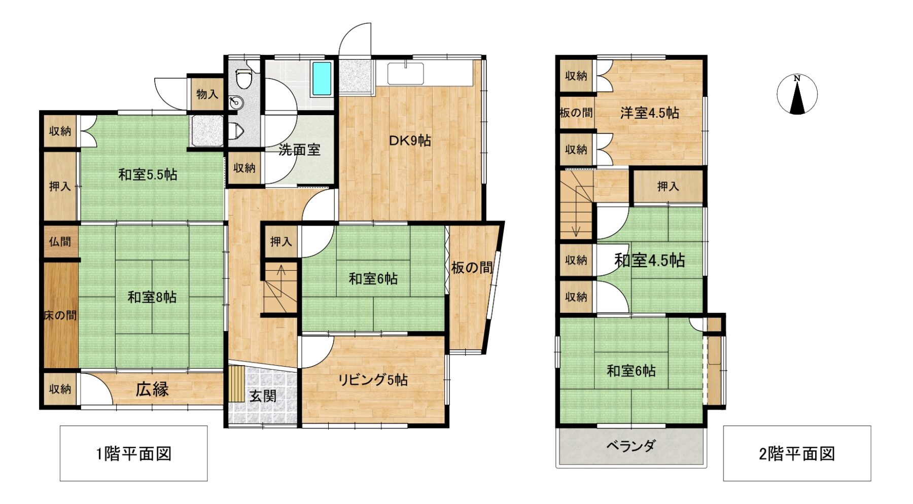| 間取 | 7DK (和室8帖×1・和室6帖×1・和室5.5帖×1・L5帖×1・DK9帖×1・和室6帖×1・和室4.5帖×1・洋室4.5帖×1) | ||