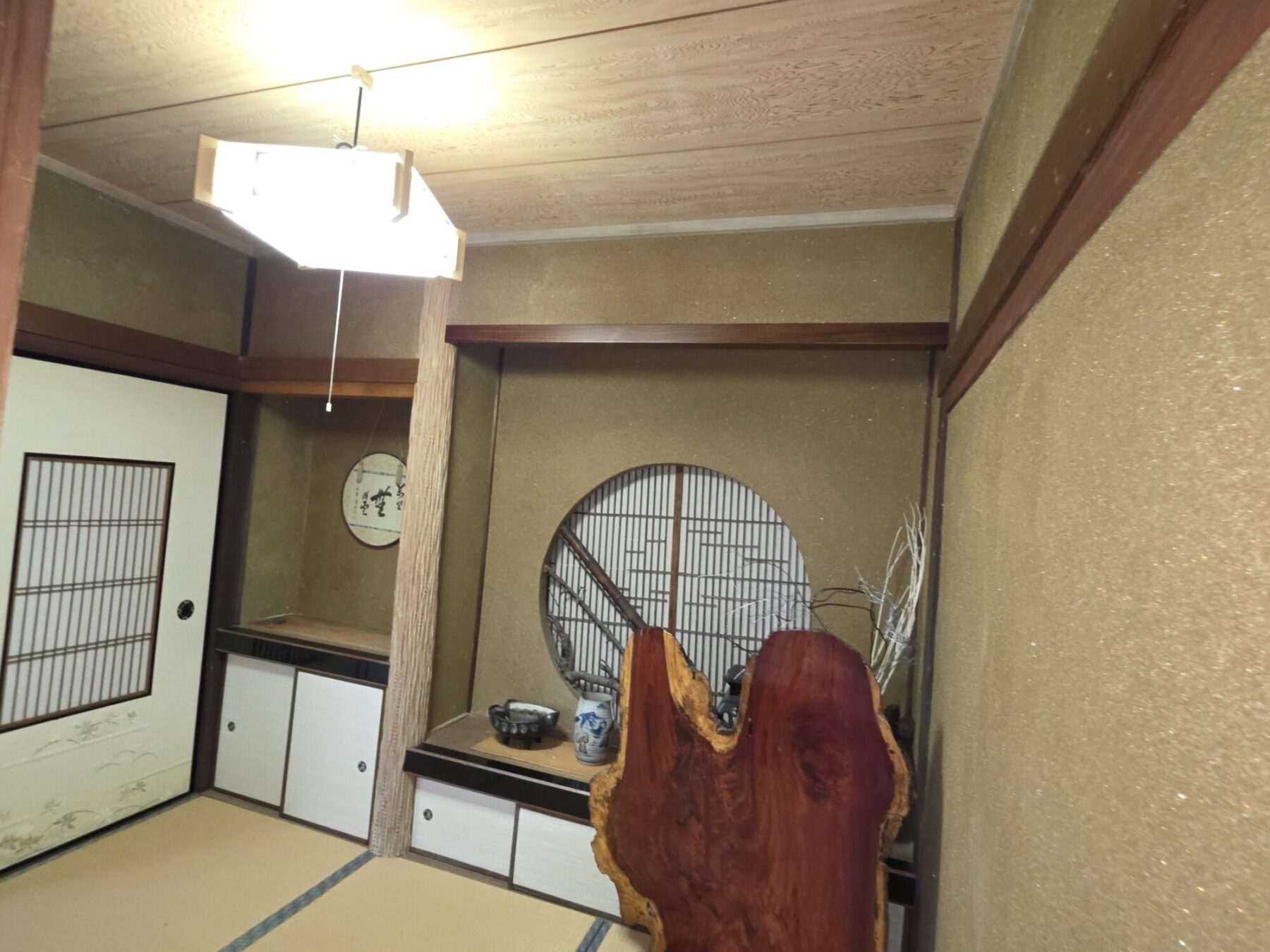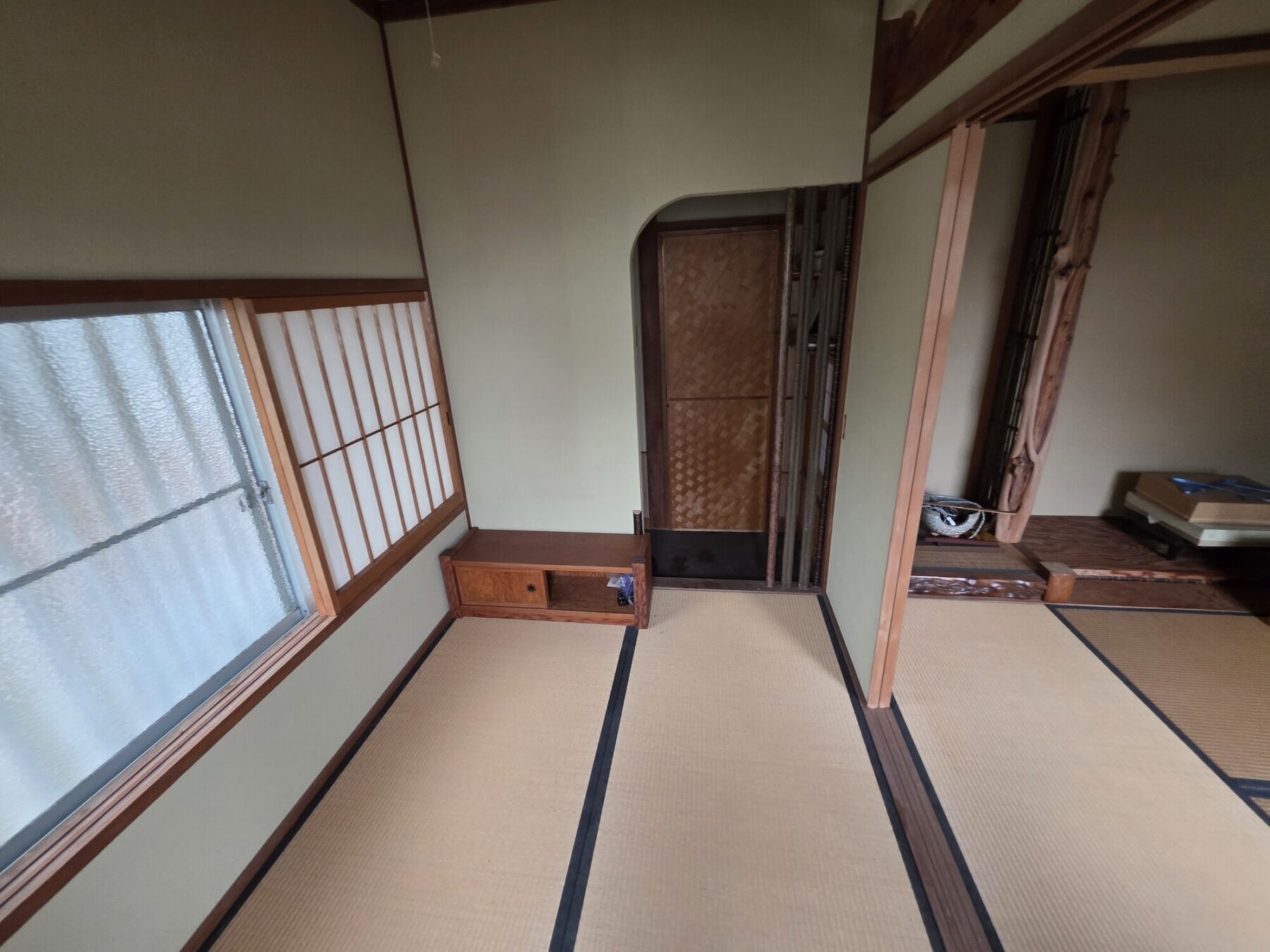 しかし、一歩足を踏み入れれば、現代の建築コストでは再現が困難なほどのゆとりある空間と意匠が息づいています。特に離れの茶室は趣深く、母屋の和室には床の間や広縁が備わっており、かつて大切な客人を迎えて豊かな時間を刻んできた歴史を感じさせます。