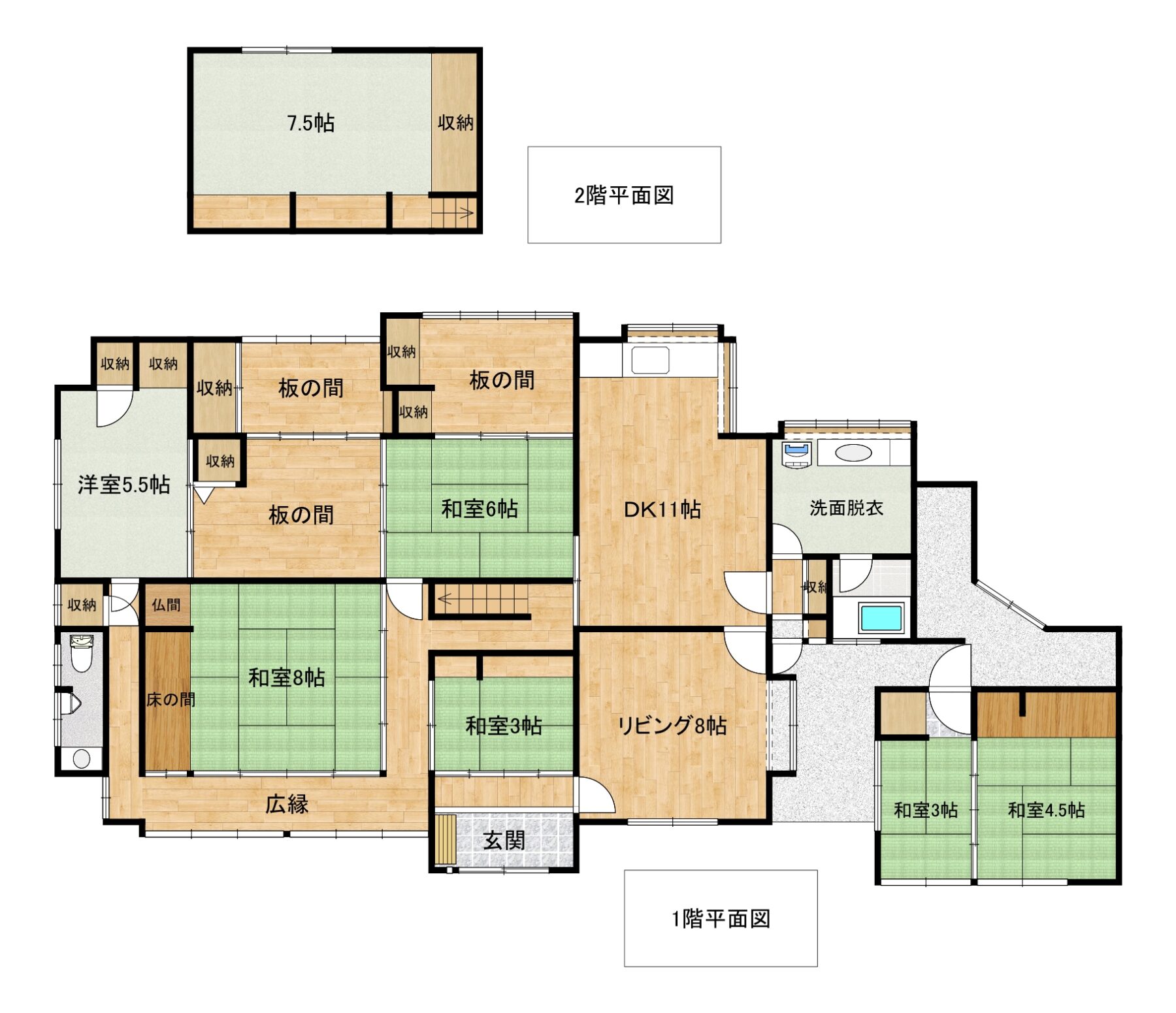 | 間取 | (DK11帖×1・L8帖×1・和室3帖×1・和室6帖×1・和室8帖×1・洋室5.5帖×1・洋室7.5帖×1・和室3帖×1・和室4.5帖×1) | ||||